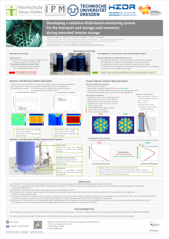 Das Ziel des Vorhabens besteht darin, Ansätze der strahlungsfeldbasierten Diagnostik zu Gammastrahlung, Neutronenfluss und Myonen in Form von Simulationen und Experimenten vertieft zu untersuchen um im Endergebnis ein validiertes und einsetzbares Monitoringverfahren speziell für CASTOR-Behälter zu entwickeln. Dies schließt erstmals Feldstudien an realen Behältern in verschiedenen Zwischenlagern ein. Das Vorhaben befasst sich nicht mit der Untersuchung von möglichen Veränderungs- oder Schädigungsmechanismen für die zwischengelagerten Brennelemente, sondern widmet sich der vertieften Analyse sowie experimentellen Bewertung radiometrischer Nachweisverfahren für größere, weitestgehend geometrische, Veränderungen des Behälterinventars auf der Basis von Gamma-, Neutronen- und Myonenfeldern.