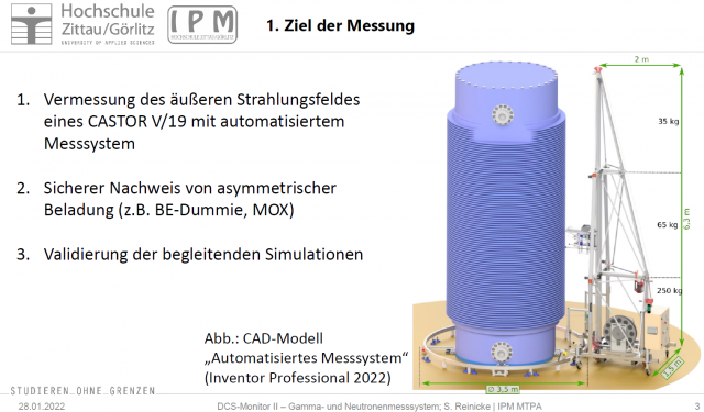 Im Teilprojekt der Hochschule Zittau/Görlitz (HSZG) erfolgt neben der kontinuierlichen Analyse aktueller Forschungsergebnisse zu potenziellen Hüllrohrschäden und Kernbrennstoffverteilungen bei verlängerter Zwischenlagerung auch die Qualifizierung der Gamma- und Neutronenmesstechnik für das Zwischenlager sowie die Konzeption und der Aufbau eines teilautomatisierten Strahlungsmesssystems. Darüber hinaus erfolgt die Konzeptionierung und Durchführung von Experimenten in enger wissenschaftlicher Zusammenarbeit mit der Professur für Bildgebende Messverfahren für die Energie und Verfahrenstechnik (PBM) am Helmholtz-Zentrum Dresden-Rossendorf (HZDR), welche ihrerseits die Myonenbildgebung an Transport- und Lagerbehältern (TLB) qualifiziert und erprobt.